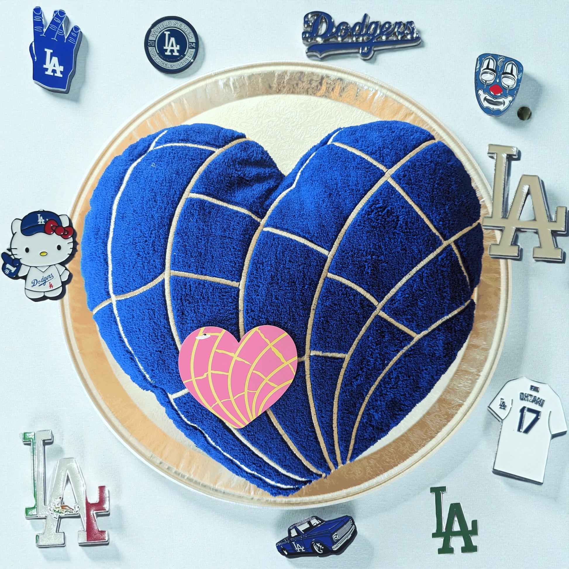 This special edition Corazon Concha heart cushion was made in collaboration with Tr3s Leches Cafe in Phoenix. Note: the cushion ships compressed. Fluff cushion by hand after opening and it will expand to full size. Measures about 16" L x 9" W x 5" H. Original design by Xochico™.